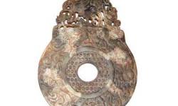 玉璧,是中国古代玉器中最为常见且流传最为久远的器类之一。其存在几乎贯穿整个古代玉器制作史,在近七千年的漫长岁月之中,玉璧见证了中国古代社会政治、经济、文化的演进。早在距今6000多年前的新石器时代良渚文化遗存中就有数量较多且制作较为精美的玉璧发现,其后绵延发展于殷商、两周直至政治统一、经济发展、玉文化繁荣的两汉达到鼎盛。汉代的玉璧主要用于礼仪、陪葬,有的玉璧也可用来装饰墙壁或作为嵌饰装点铜枕和带钩;一些较小的玉璧用作组玉佩的一部分供佩系,亦被称作系璧。此件汉代风格的浮雕龙纹玉璧。如上图所示,此件玉璧