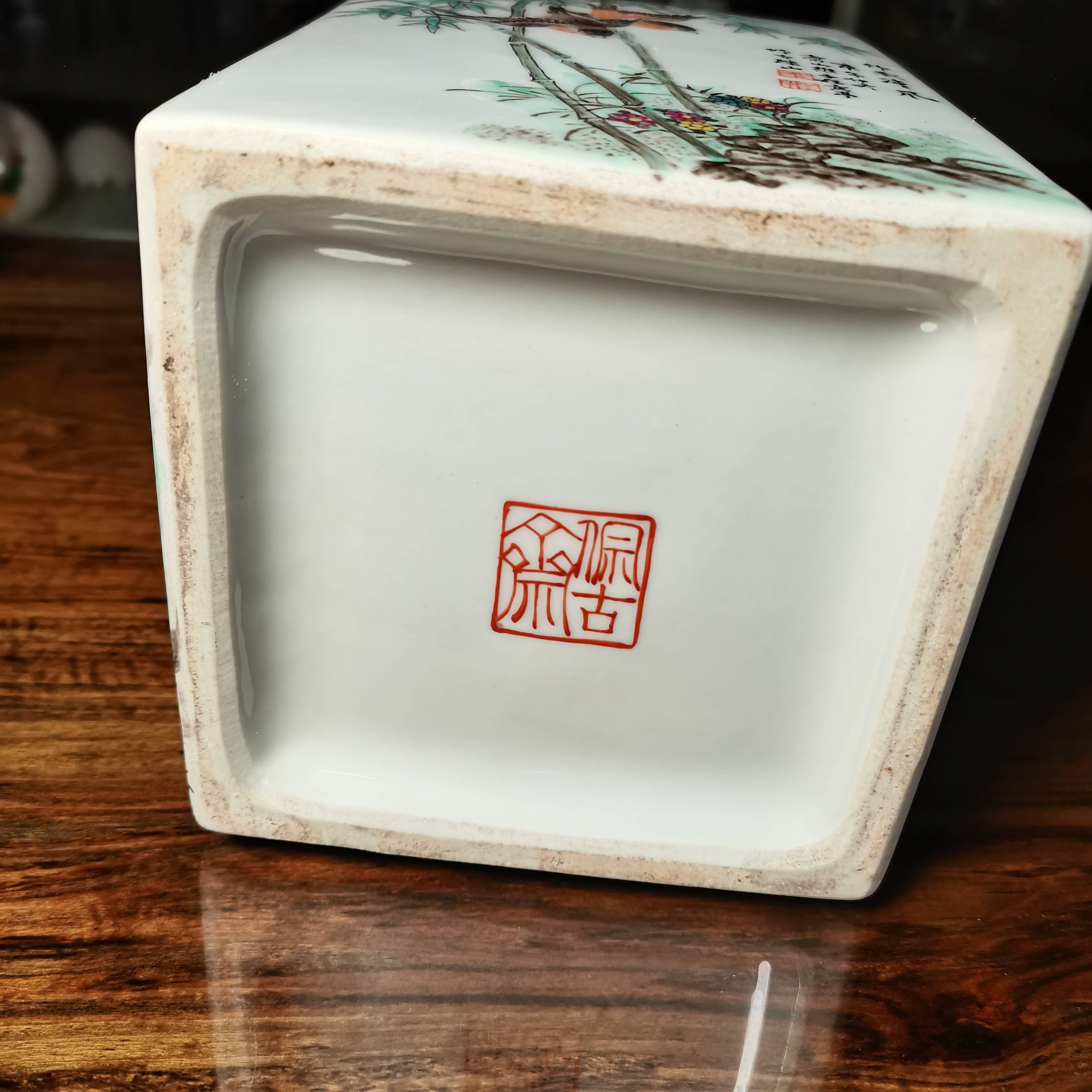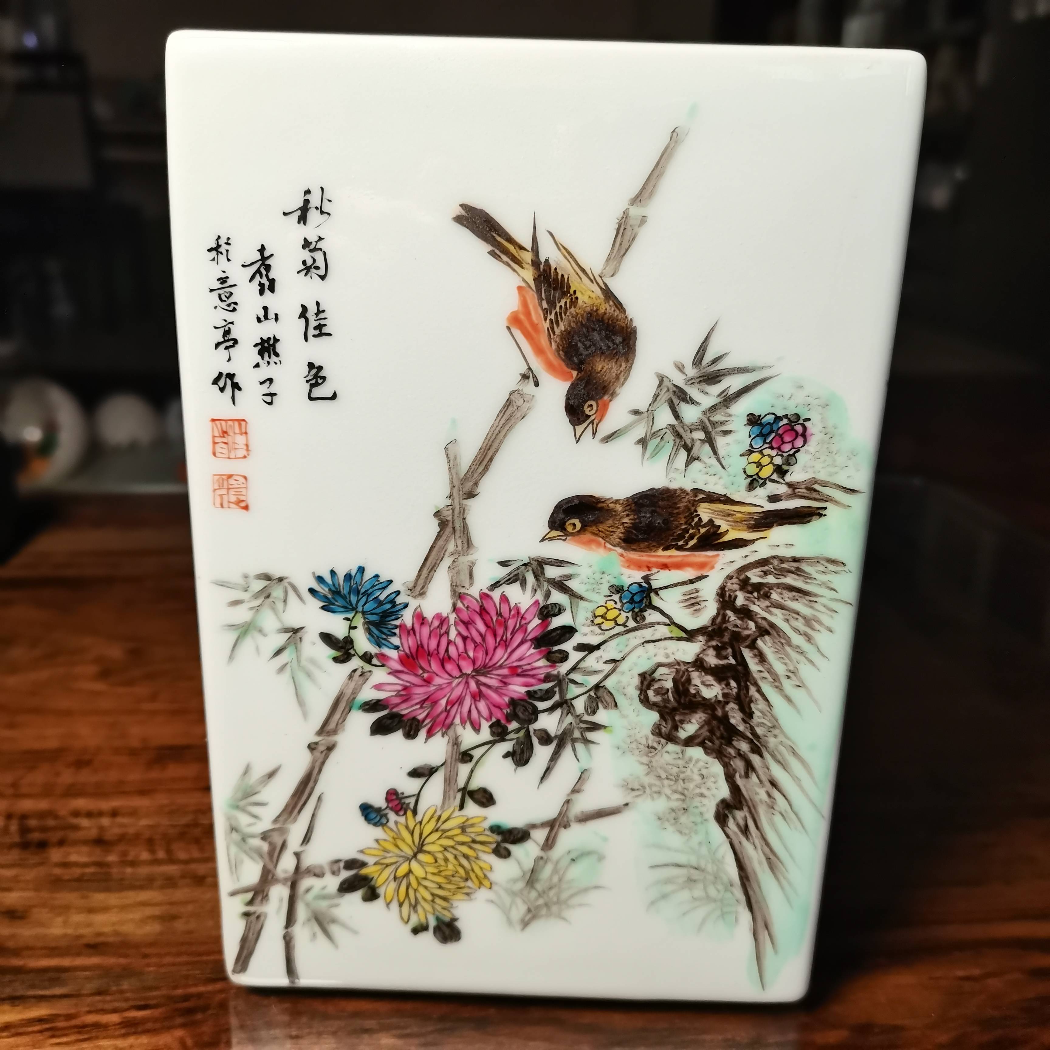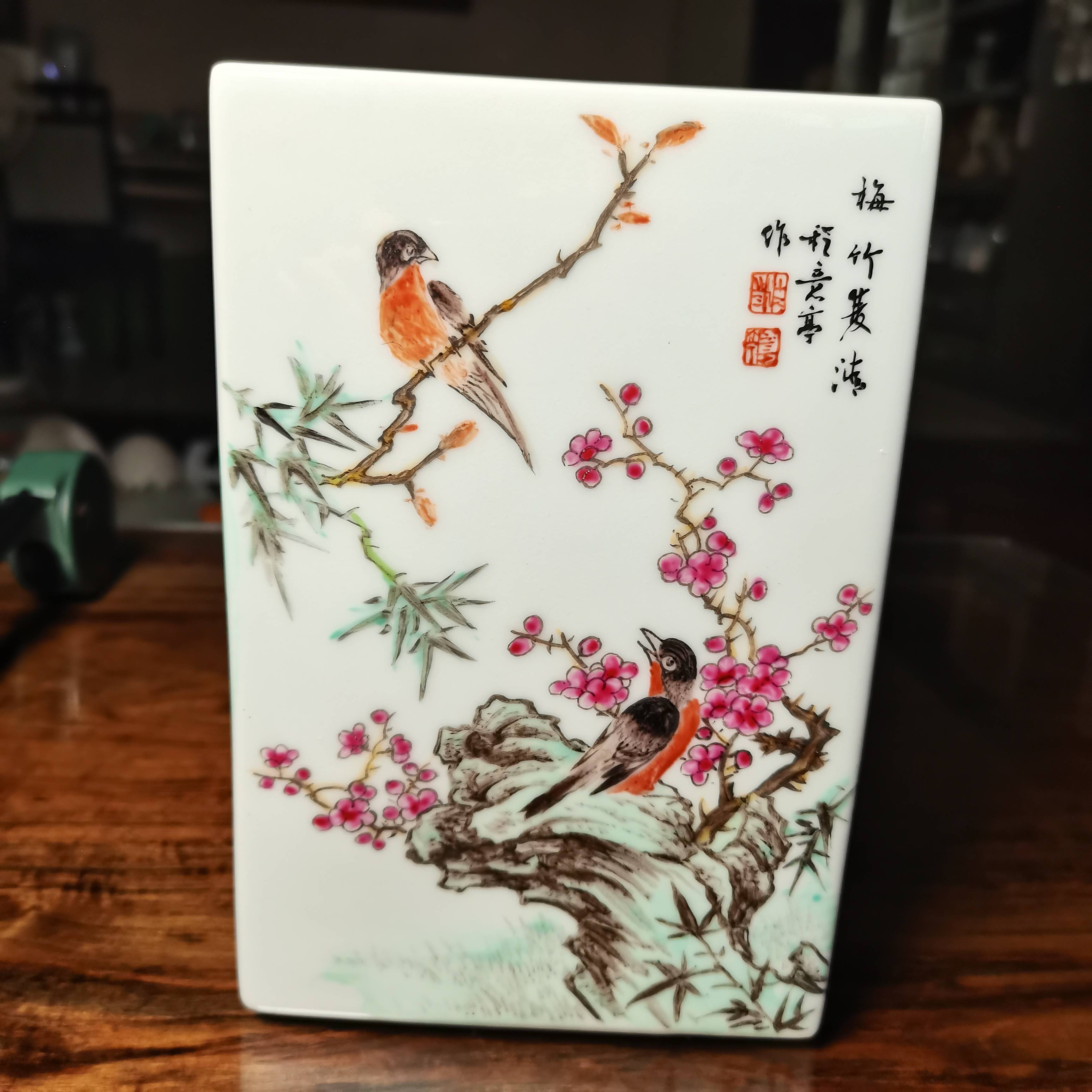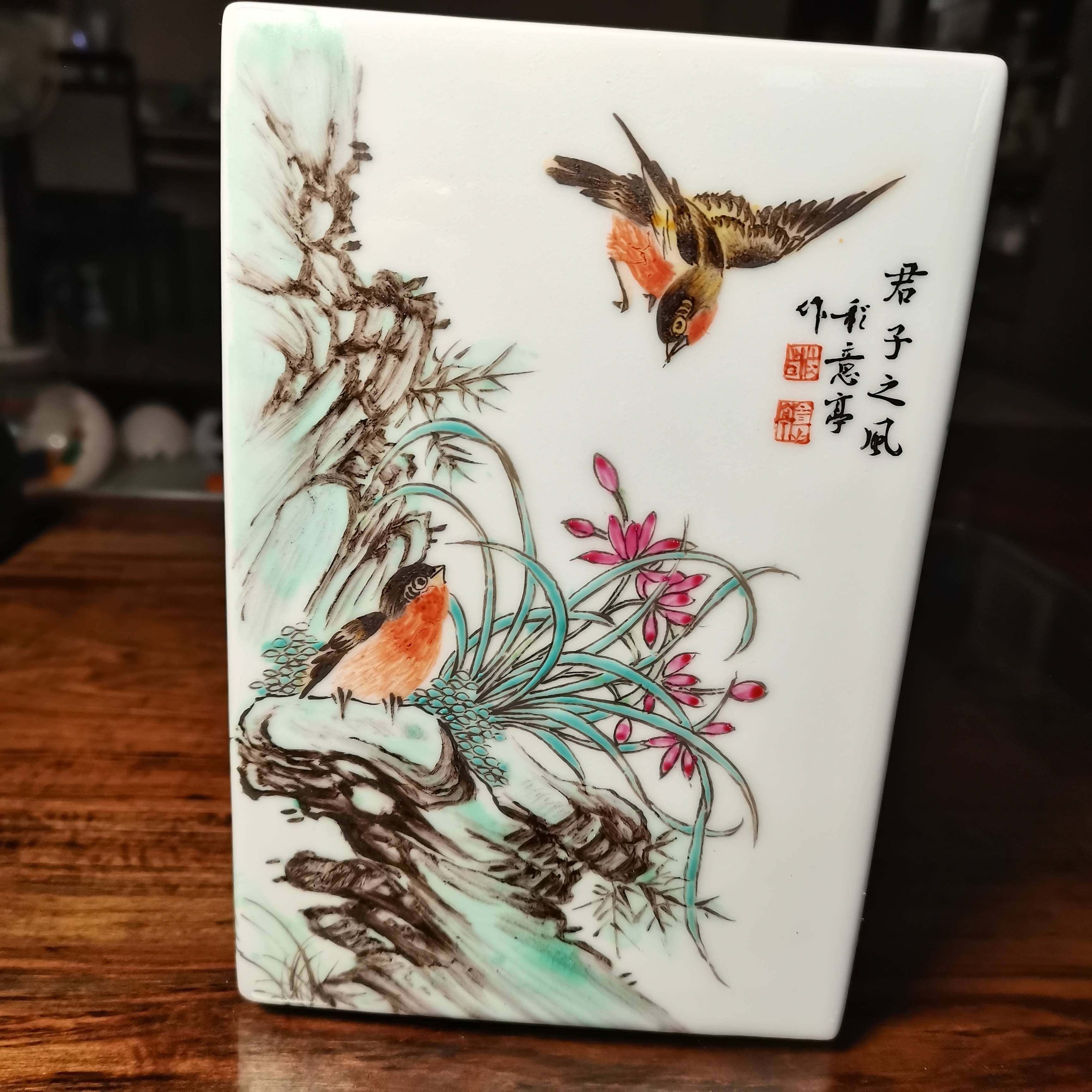 精品赏析—程意亭梅兰竹菊花鸟四方镶器程意亭(1895—1948),原名程体孚,号翥山樵子 ,江西乐平人,是珠山八友中的重要成员,在民国瓷画领域占据着举足轻重的地位。他出身平凡,自幼便经历生活的磨砺,8 岁丧父后,由兄长抚养长大,14 岁时在祥盛粮行当学徒 。然而,命运的转折悄然降临,一次偶然的机会,他路过一家裱画店,被店内板壁上的纸画深深吸引,从此开启了对绘画艺术的追求之旅。1911 年,年仅 16 岁的程意亭毅然离家,考入 “江西省立甲种工业窑业学校” 图画科,师从张晓耕、潘陶宇两位名师,系统学习山水花鸟绘画技巧。 在求学过程中,程意亭展现出了非凡的艺术天赋和勤奋刻苦的精神。他对绘画的热爱近乎痴迷,常常废寝忘食地钻研绘画技巧,临摹名家作品。凭借着扎实的基本功和对艺术的独特理解,他在绘画领域逐渐崭露头角。毕业后,他先后在九江 “普芳居” 瓷店和上海等地从事瓷上绘画创作,并拜海派花鸟画家程璋为师,进一步提升了自己的绘画技艺。程璋早年宗没骨法工笔花卉,中年后改变技法,采用西画明暗透视之术,色彩浓丽、构图别致且不落俗套。程意亭在程璋身边学习的三年里,不仅掌握了程璋的绘画技法,还深受其创新精神的影响,为他日后在瓷上花鸟画领域的发展奠定了坚实的基础。 程意亭梅兰竹菊花鸟四方镶器(高20cm宽13.5cm重2.45kg)