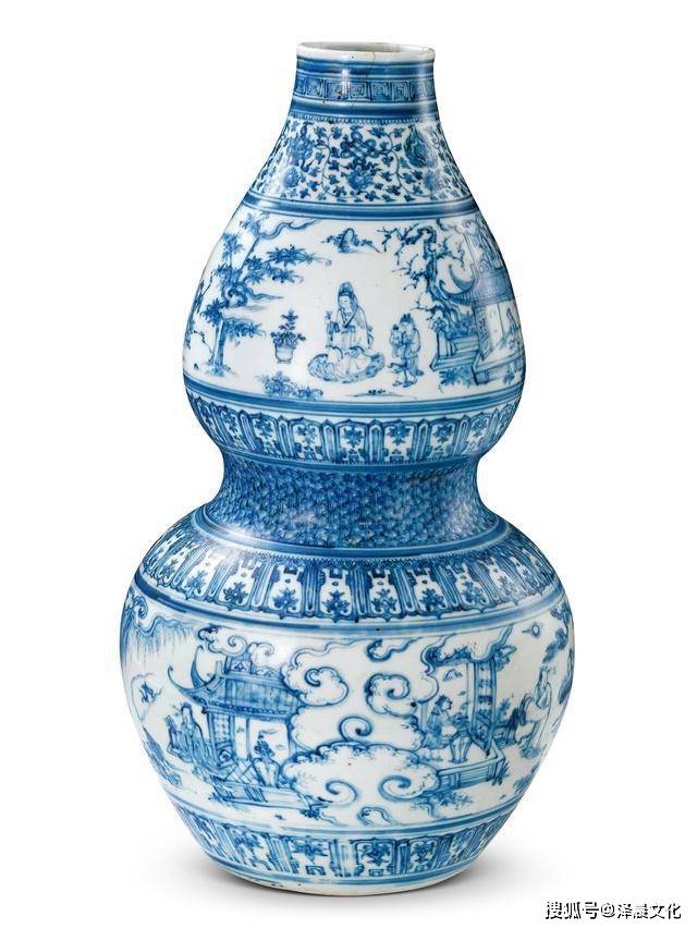高53、口径8.7、底径17厘米。这件葫芦瓶纹饰很丰富,上腹口沿处绘回纹,莲托八宝纹;主题绘云亭仙境故事,分别有:仙人观莲、赏菊、题诗、赶考四个情节;束腰处绘锦文。下腹部绘“吹箫引凤”“携琴访友”“炼丹求道”“鱼龙变化”等内容,近足部绘彼岸变化莲纹。此瓶胎质细腻,釉面莹润,青花发色淡雅微闪灰色,纹饰布局繁密,绘画工艺精湛,生动传神,虽非官窑制品,但足可与之媲美,是正德时期民窑精品。